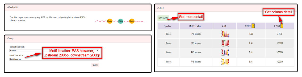 Users can select species and motif location (contain PAS hexamer, upstream 200 nt, downstream 200 nt) to query APA motif. A table with species, motif location, motif, countP and E-value will be returned. By clicking the “More Detail” button, Users can get reports from MEME or DREMW tool.