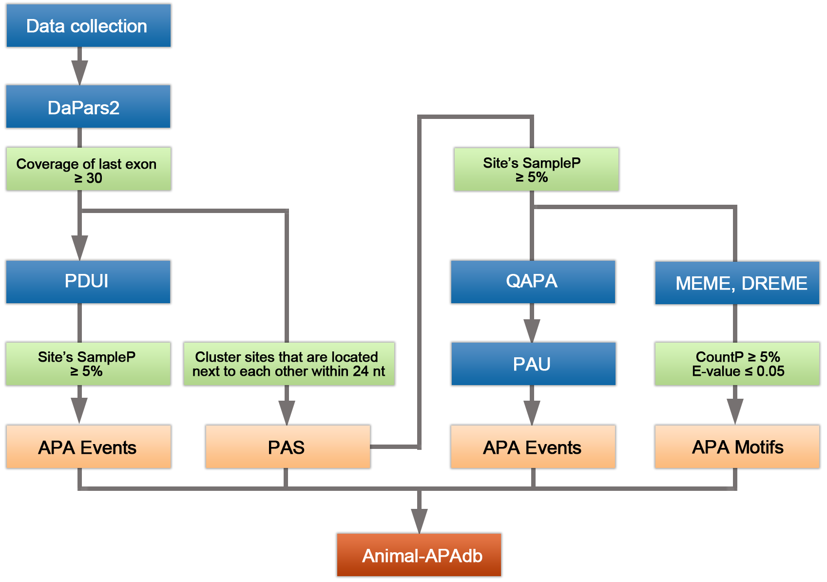 The annotation of last exons were collected from the UCSC and Ensembl. Two different algorithms were used to calculated APA events for each gene in each tissue from different species. For DaPars2, we calculated the percentage of distal poly(A) site usage index (PDUI) of APA events, and required that the average normalized reads of each 3'UTR region is ≥ 30. And at the same time, we deleted the sites which the SampleP was < 5%. For QAPA, it can calculate the poly(A) usage (PAU) by ploy(A) site annotation files from GENCODE basic poly(A) annotation track, PolyASite or custom file. We filtered sites which sampleP was < 5% and add PolyASite's annotation file which sampleP was ≥ 5% for mouse and worm.